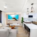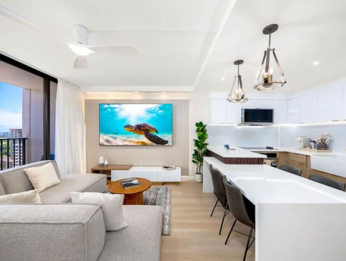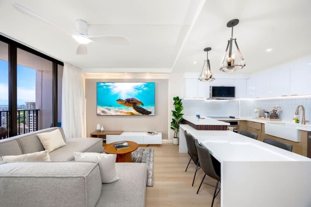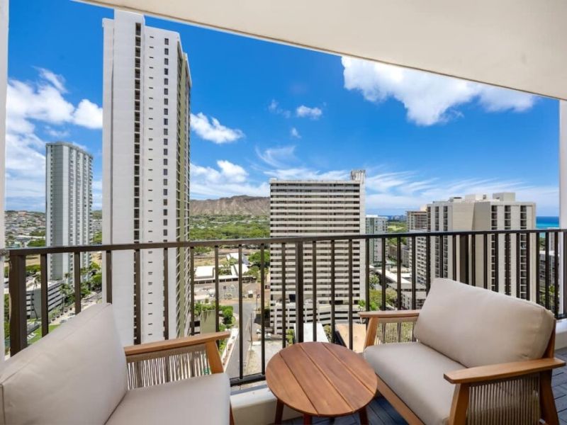 Enjoy stunning Diamond Head and partial ocean views from this remodeled 21st-floor condo at the Waikiki Banyan that sleeps 4. This modern unit features a full kitchen with upscale appliances, a spacious living area with a large sectional and 85” Smart TV, and a private lanai perfect for relaxing with a view. The bedroom offers two queen beds and large windows, and the stylish bathroom includes a walk-in shower and designer finishes. Comfort, style, and location, just steps from Waikiki Beach.