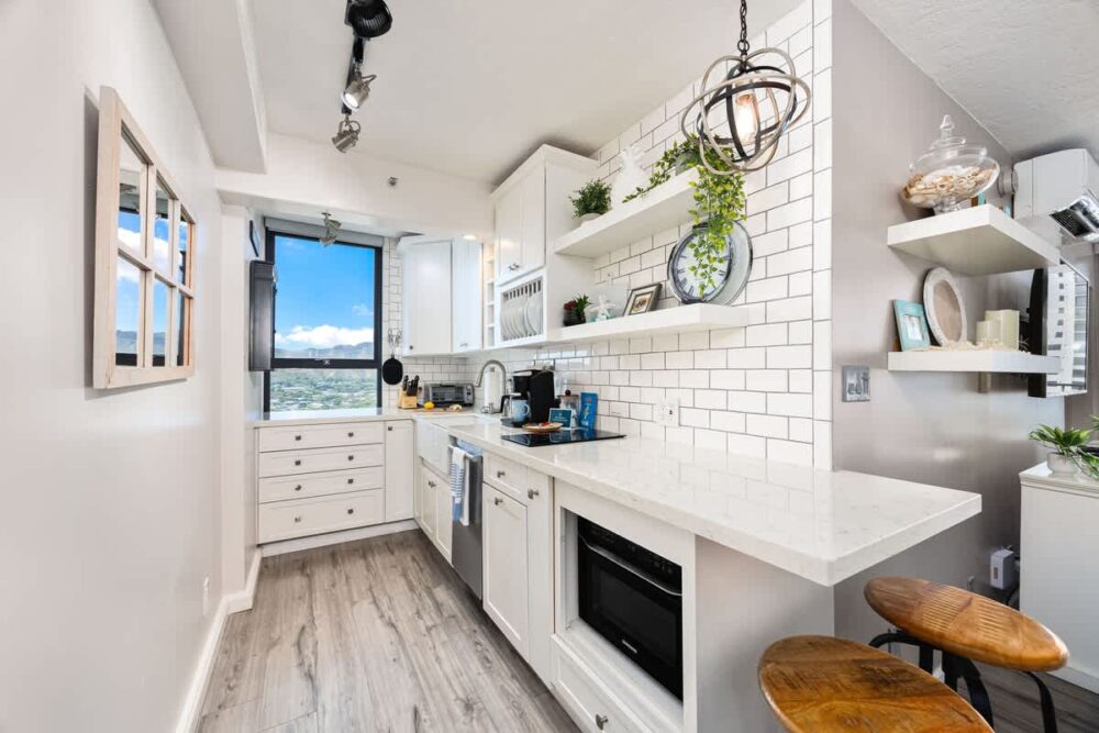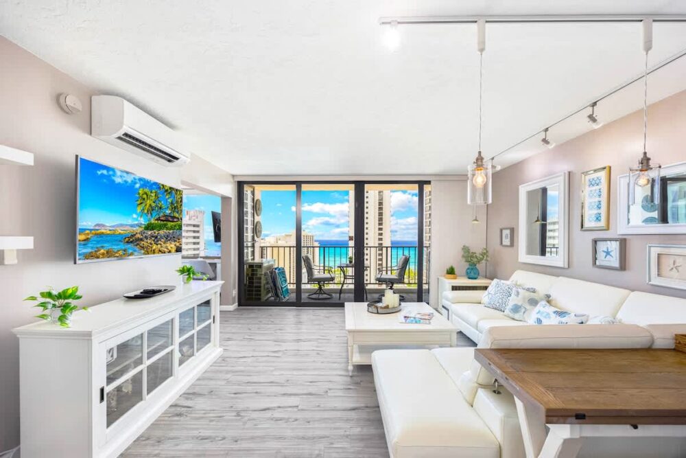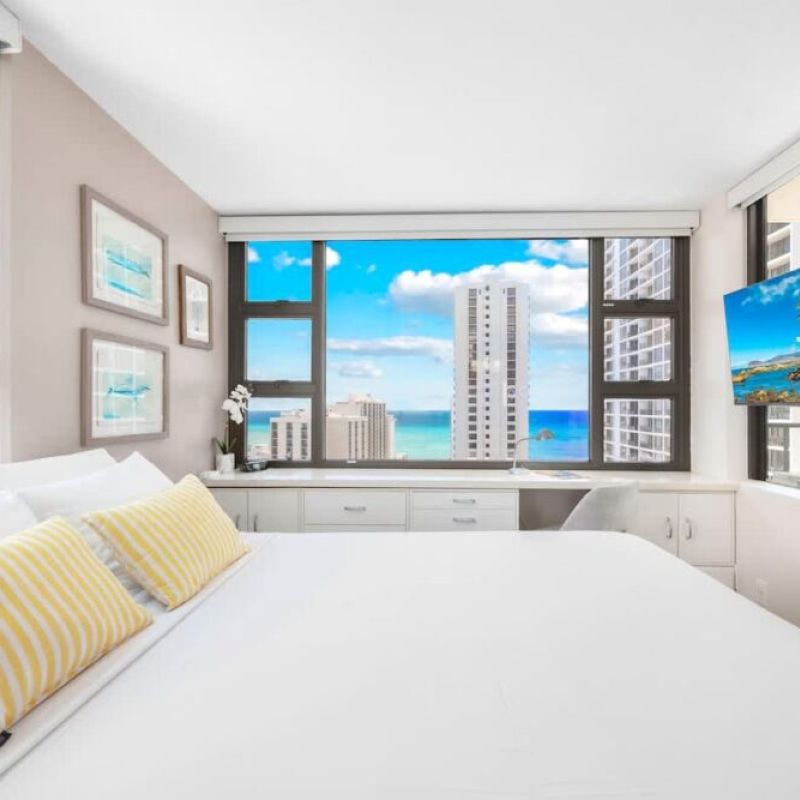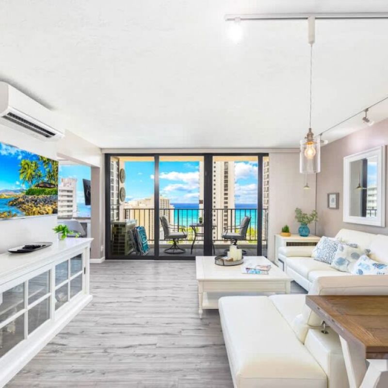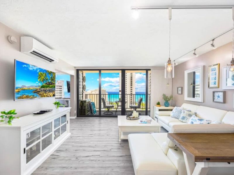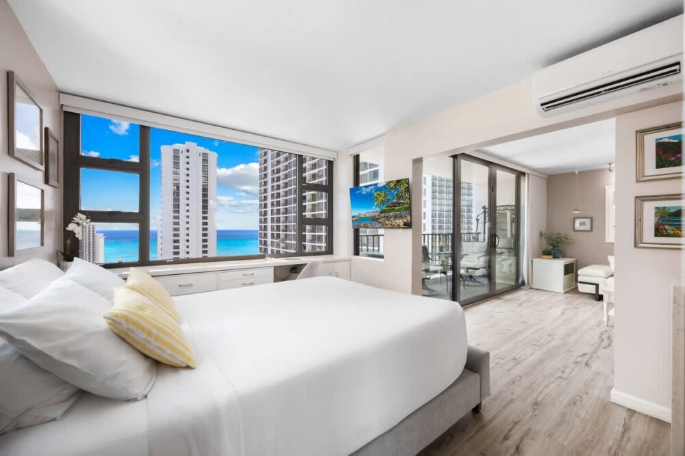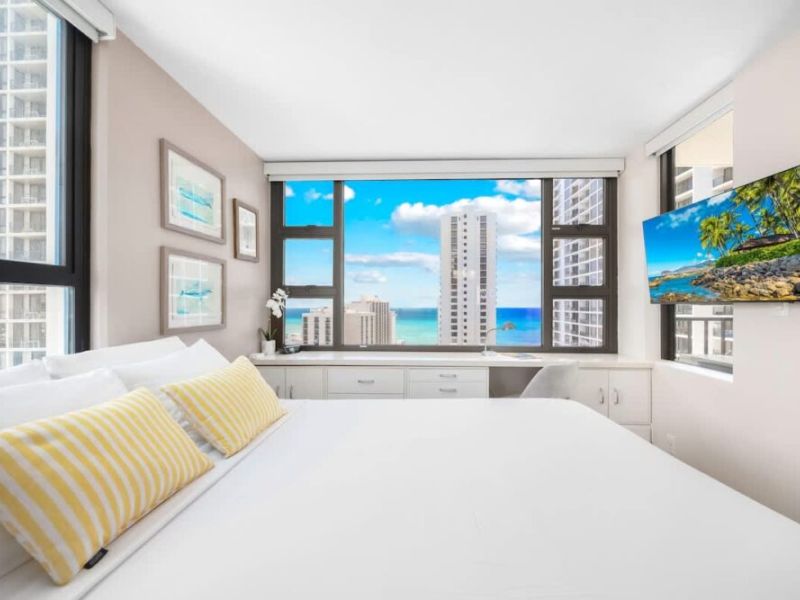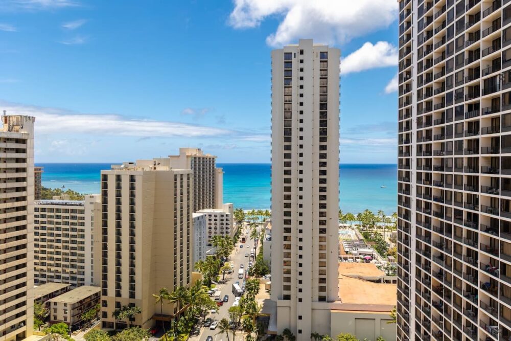 Très beau logement, avec équipement complet, très bien situé à Waikiki, à 2 min à pied de la plage et du Duke. Les baies vitrées partout dans le logement donnent une excellente vue d’ensemble sur Waikīkī. On recommande !