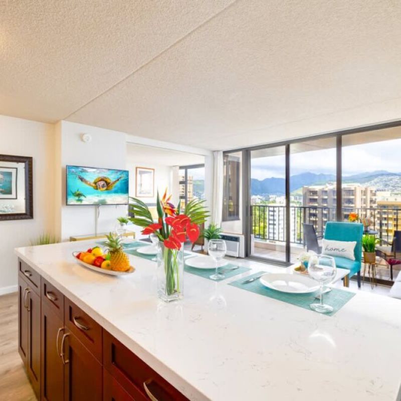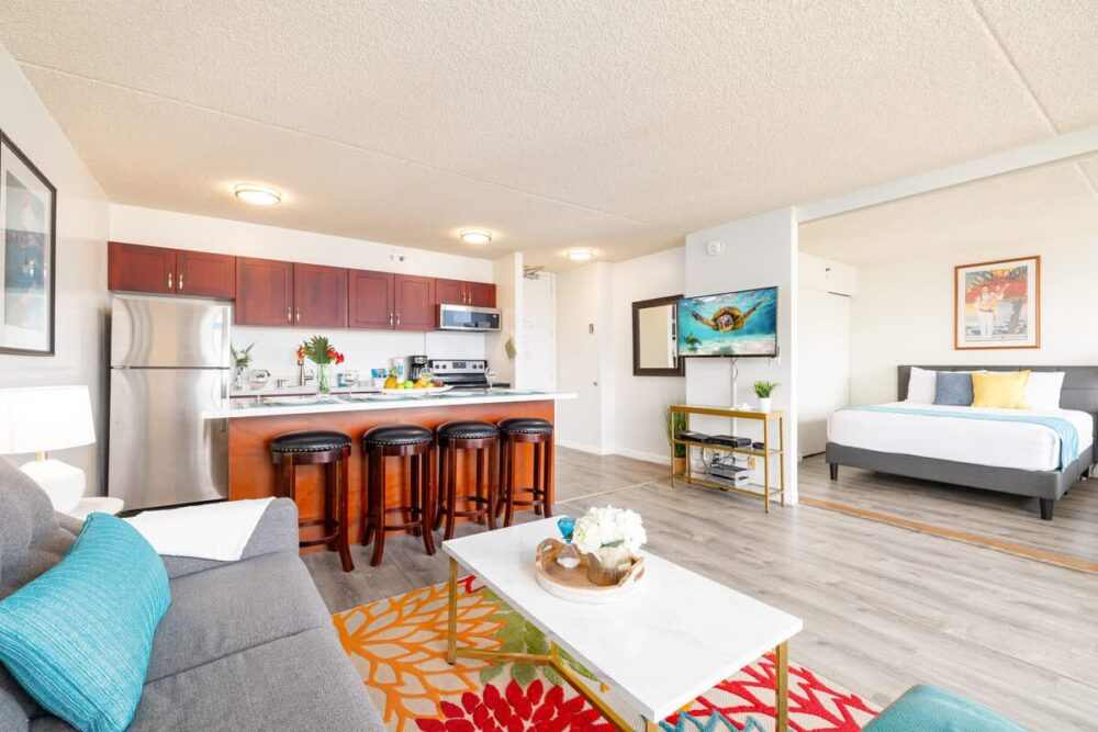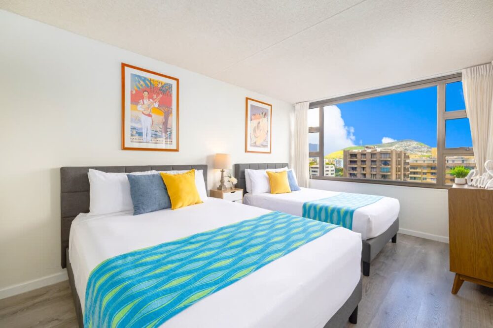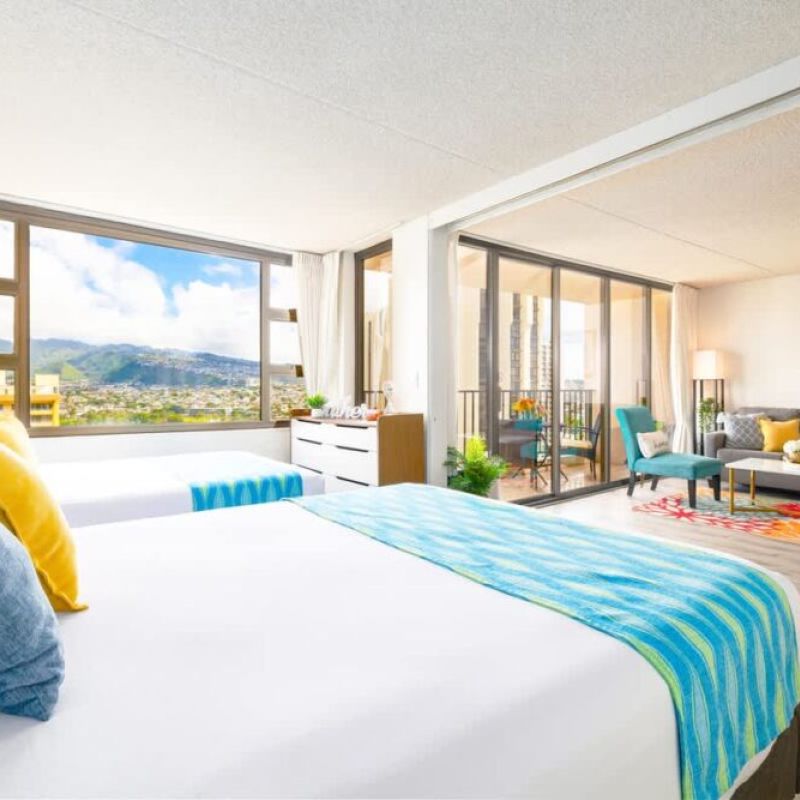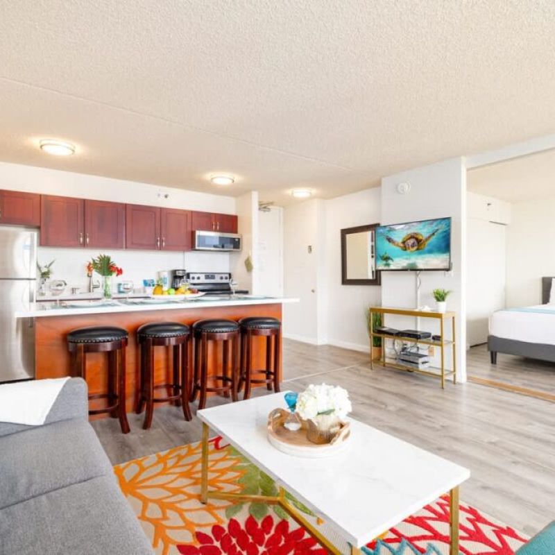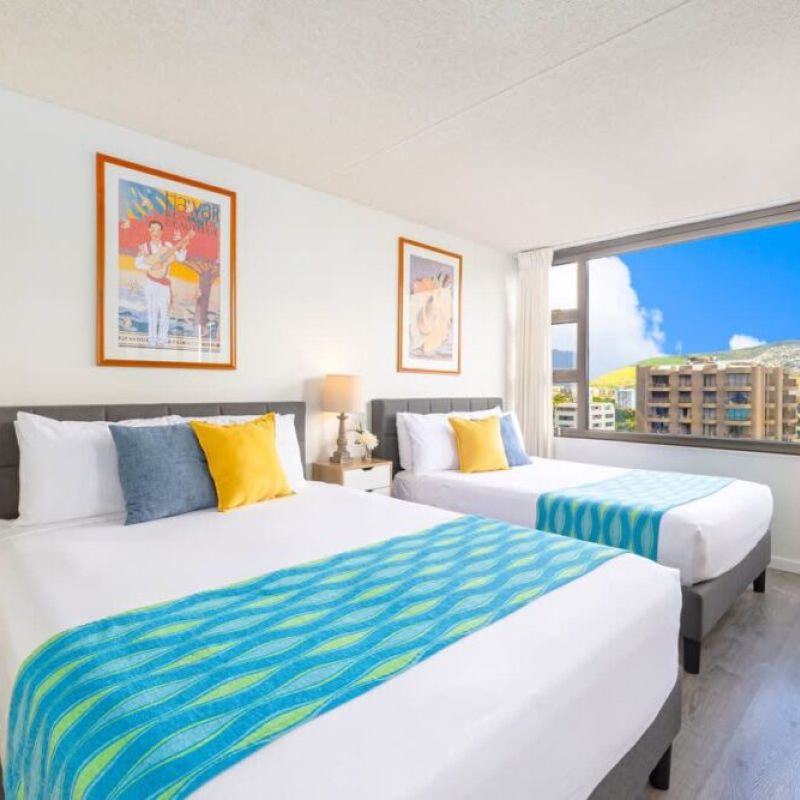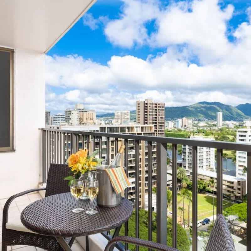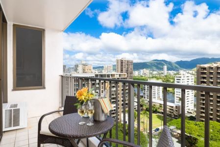 A beautiful 1-bedroom condo at the Waikiki Banyan brought to you by Midway Vacations, perfect for accommodating up to 4 guests! It’s just a stroll away from the world-renowned Waikiki Beach, as well as an array of fantastic shopping and dining options. Enjoy the added perks of free high-speed wireless internet and parking. Plus, take in the stunning mountain and city views from both the bedroom and your private balcony!