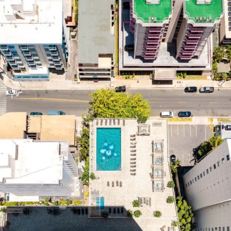 building from the pool.