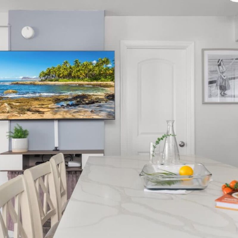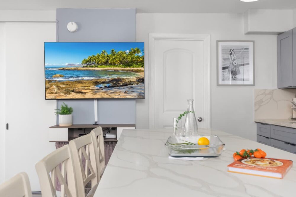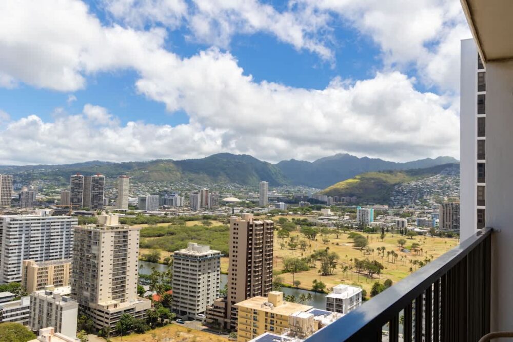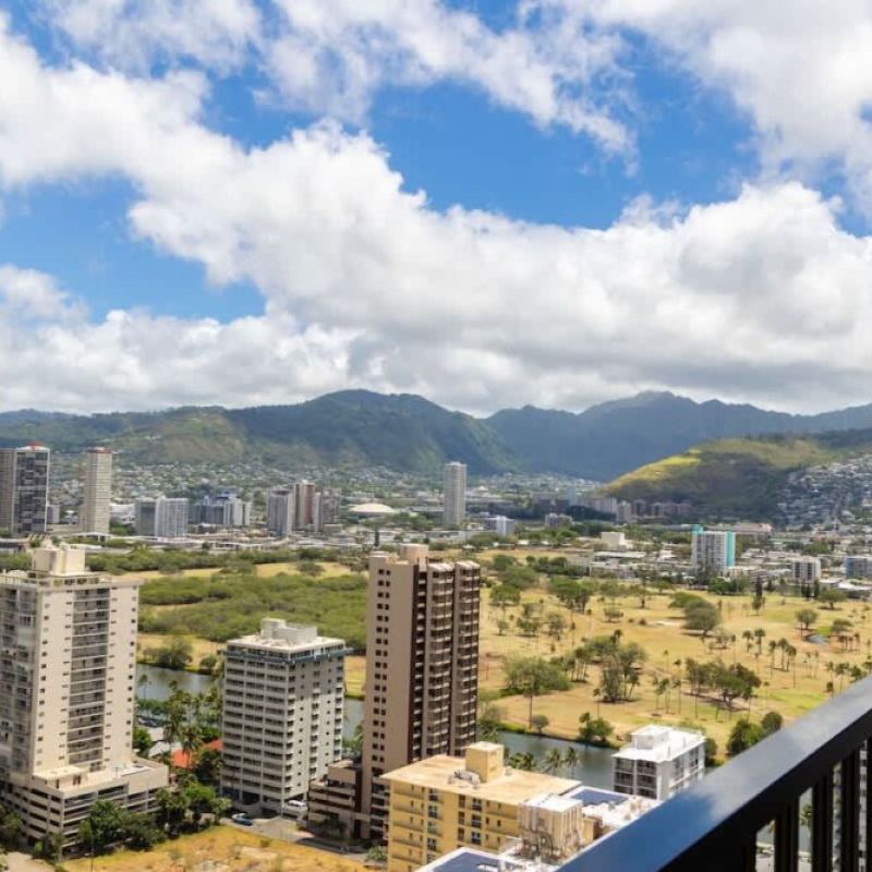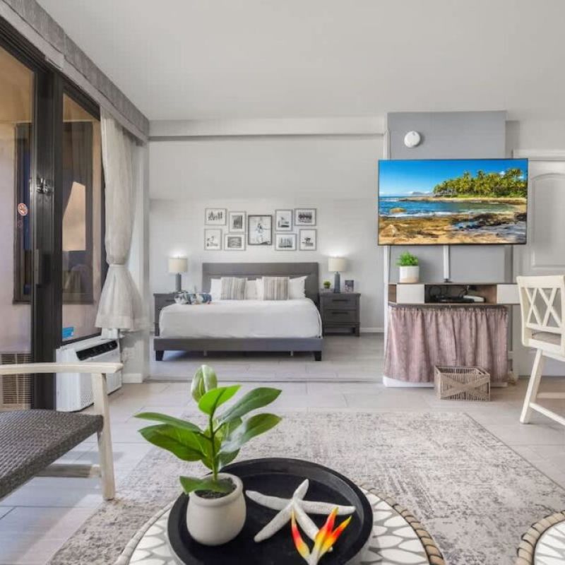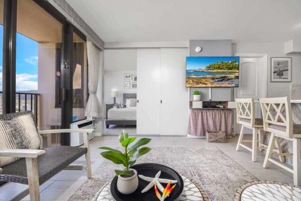 Features include a bedroom with a king bed, pull-out sofa, 55″ Smart TV, full kitchen, and modern bath with a walk-in shower. Step onto the balcony for stunning city, mountain, and ocean views. Just a short stroll to Waikiki Beach, shopping, and dining—plus free Wi-Fi and parking for a convenient stay!