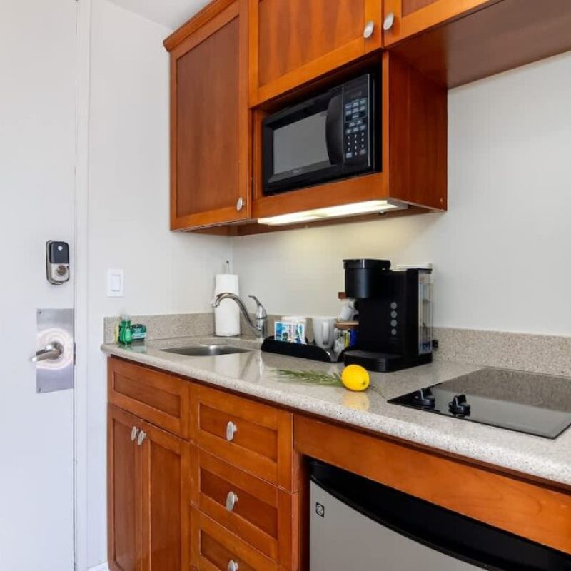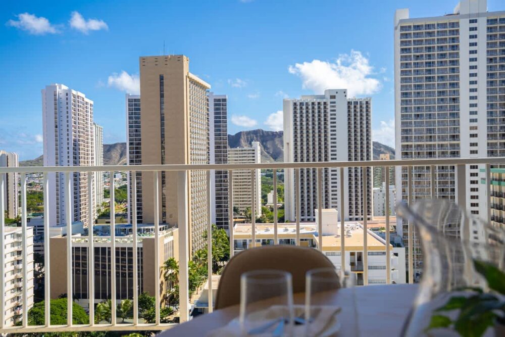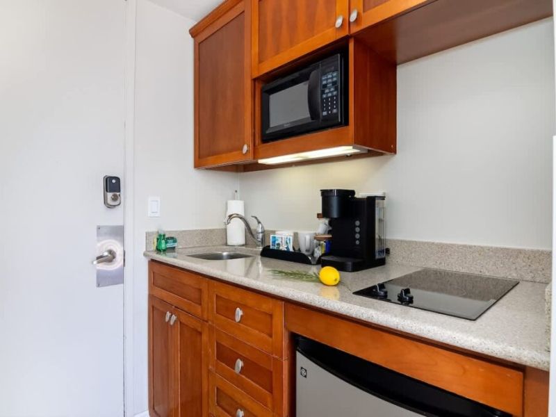 Aneks kuchenny jest bardzo dobrze wyposażony, w niezbędne naczynia do przygotowania śniadania czy lekkiego posiłku. W kuchni są podstawowe przyprawy, kawa i herbata. Bezpośrednio w budynku jest mała kawiarnia z pyszną kawą rano. W okolicy jest wiele restauracji zarówno na śniadania jak i lunch i kolację. Waikiki to bardzo gwarne i głośne miejsce, mocno komercyjne i zupełnie inne niż północna część wyspy czy pozostałe wyspy archipelagu – trzeba to mieć na uwadze wybierając ten apartament.