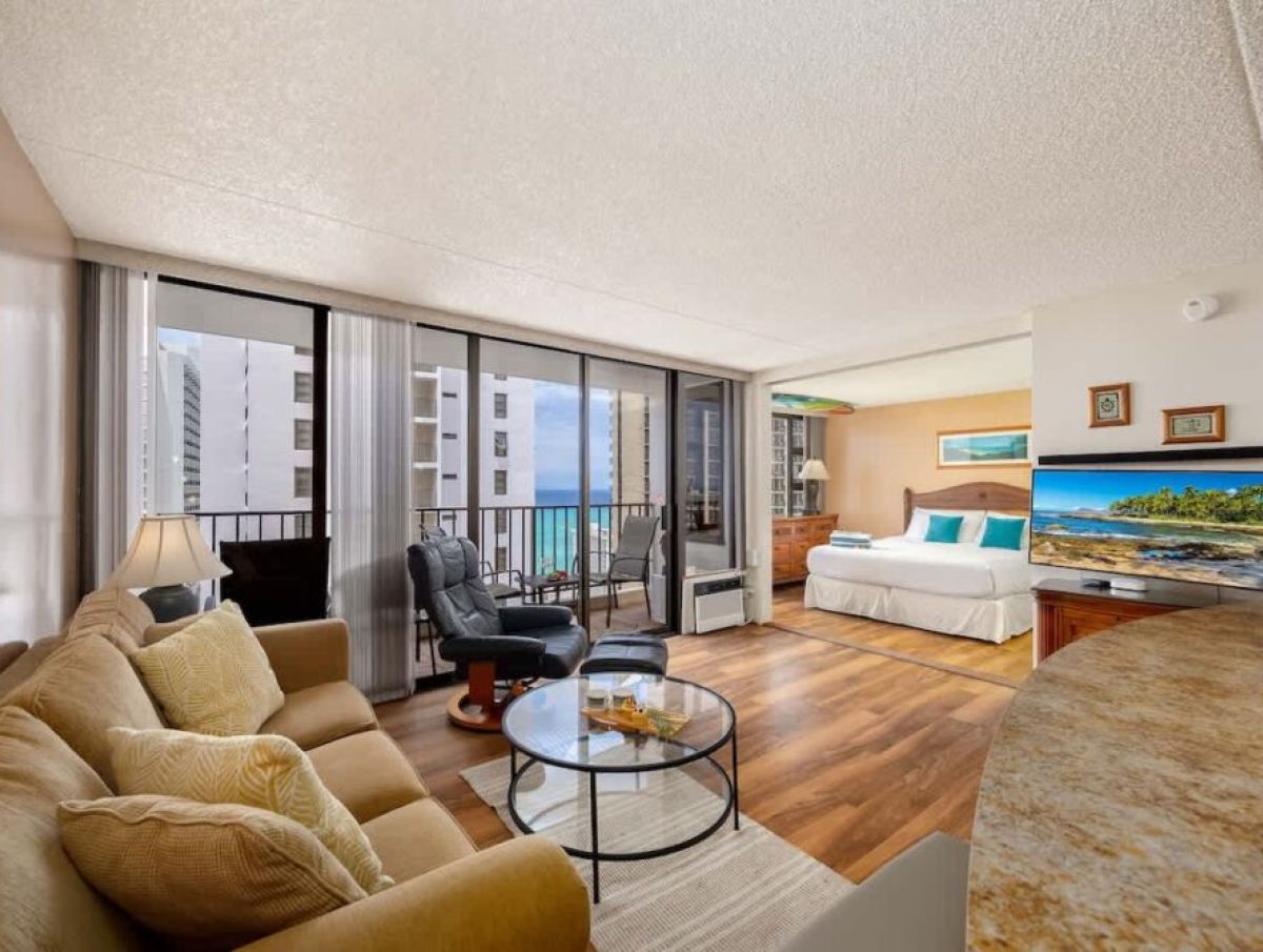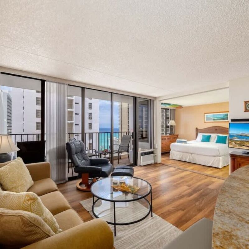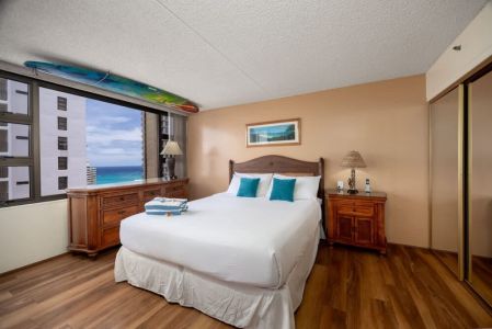 Experience island living in this charming, newly renovated 1-bedroom suite at the Condominium Hotel Waikiki Banyan, proudly managed by Midway Vacations. Perfect for up to 4 guests, this comfortable retreat is just a short walk from Waikiki Beach, great shopping, and delicious dining. Enjoy stunning ocean views, free high-speed Wi-Fi, and complimentary parking during your stay!