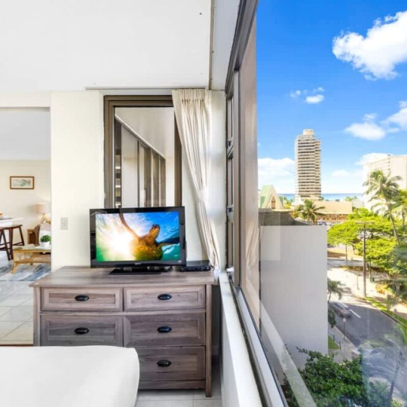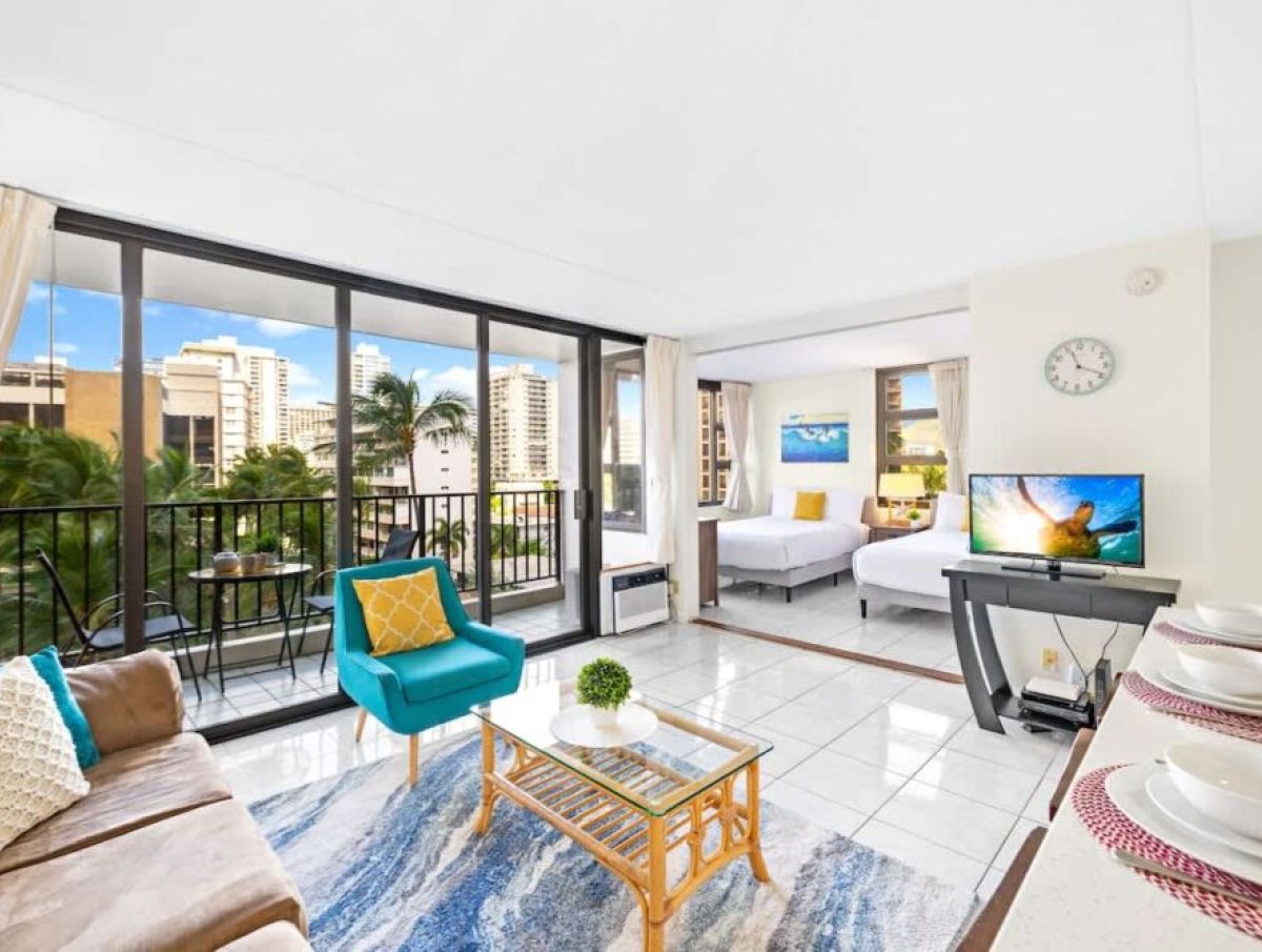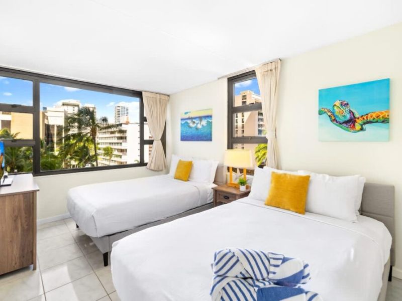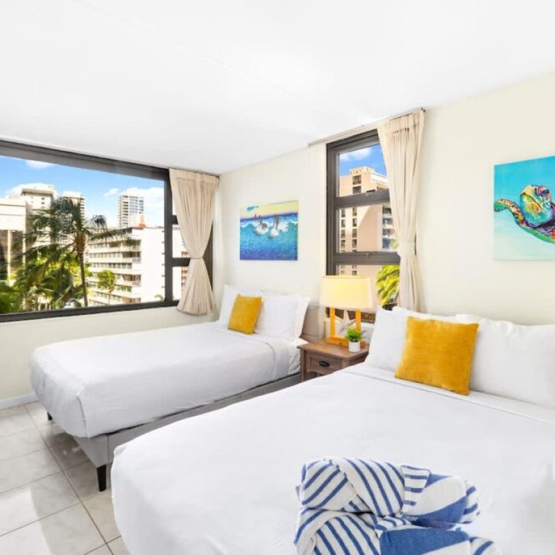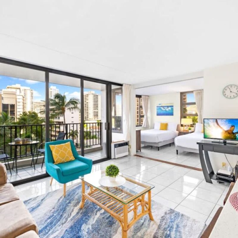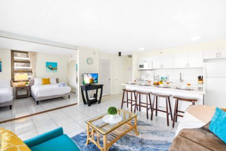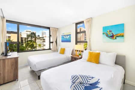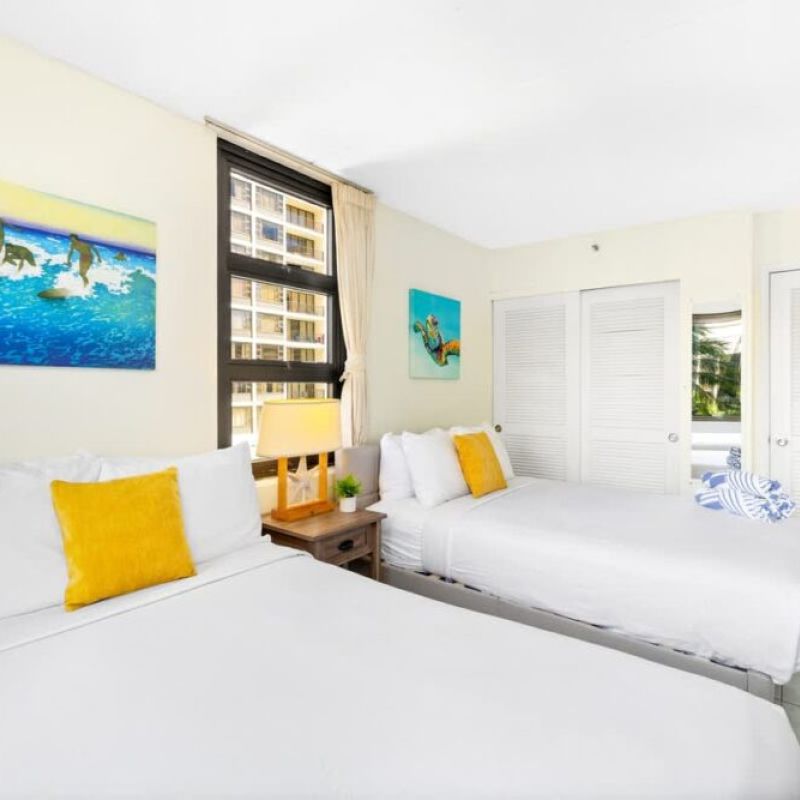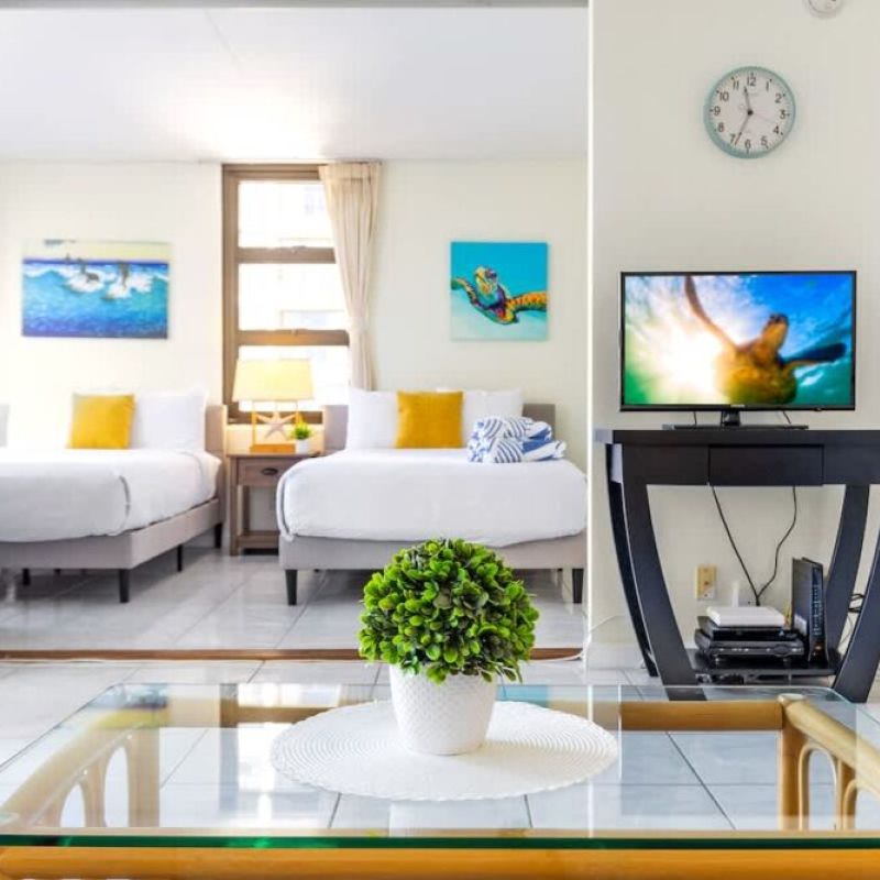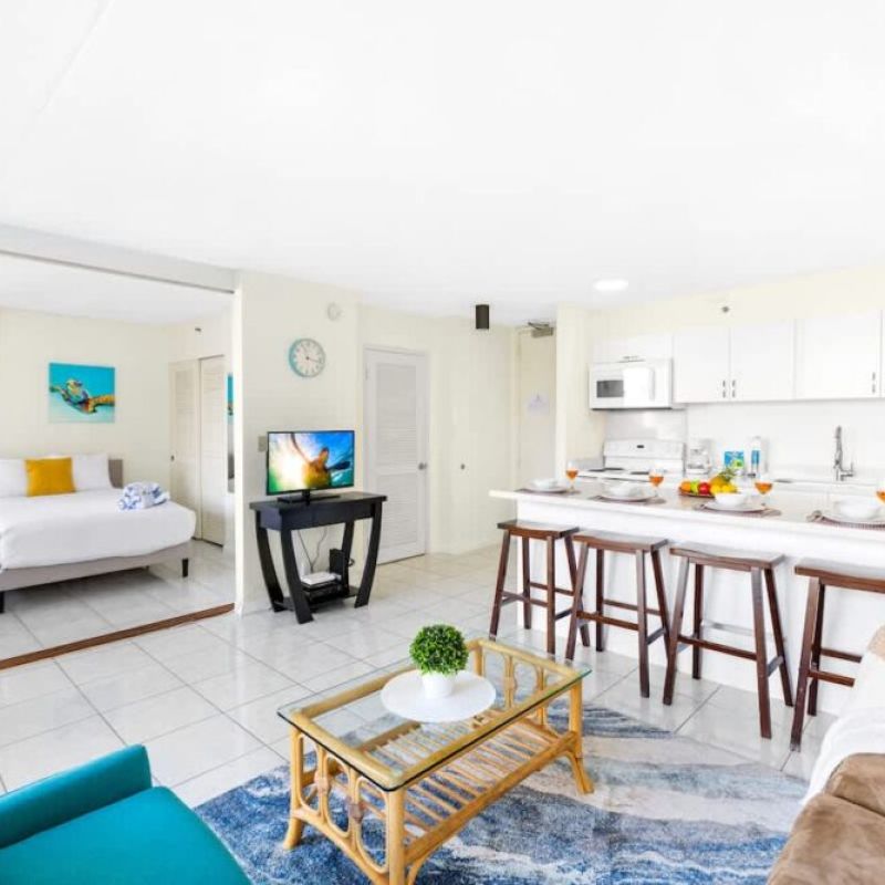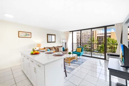 Beautifully renovated 1-bedroom suite within the Condominium Hotel Waikiki Banyan. Sleeps 4 guests and is conveniently situated within walking distance of Waikiki Beach, shopping venues, and restaurants. Plus, you’ll have access to complimentary parking and high-speed wireless internet, all while savoring partial ocean views!