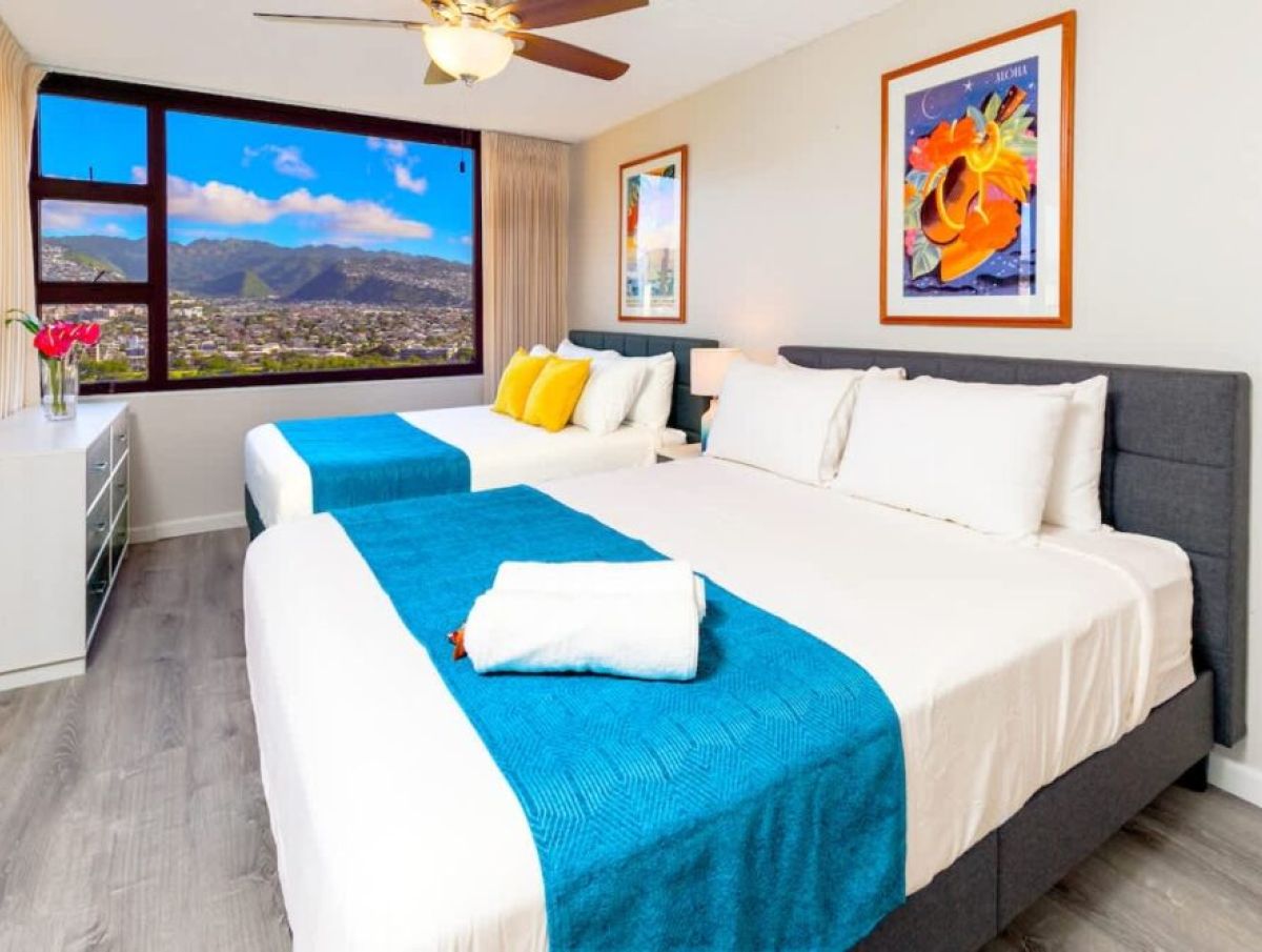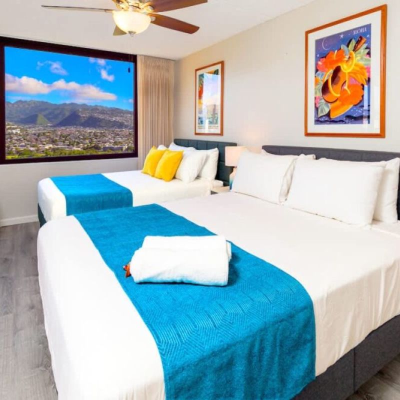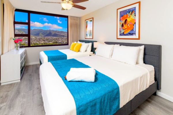 This beautiful 1-bedroom unit is brought to you by Midway Vacations, suitable for a variety of guests, including couples, solo travelers, business professionals, and families with children. It accommodates up to 4 guests and is located within the Waikiki Banyan, just a short stroll away from the renowned Waikiki Beach, shopping districts, and a multitude of dining options. Enjoy free parking, and revel in the stunning views of the mountains and cityscape in the bedroom and the balcony!